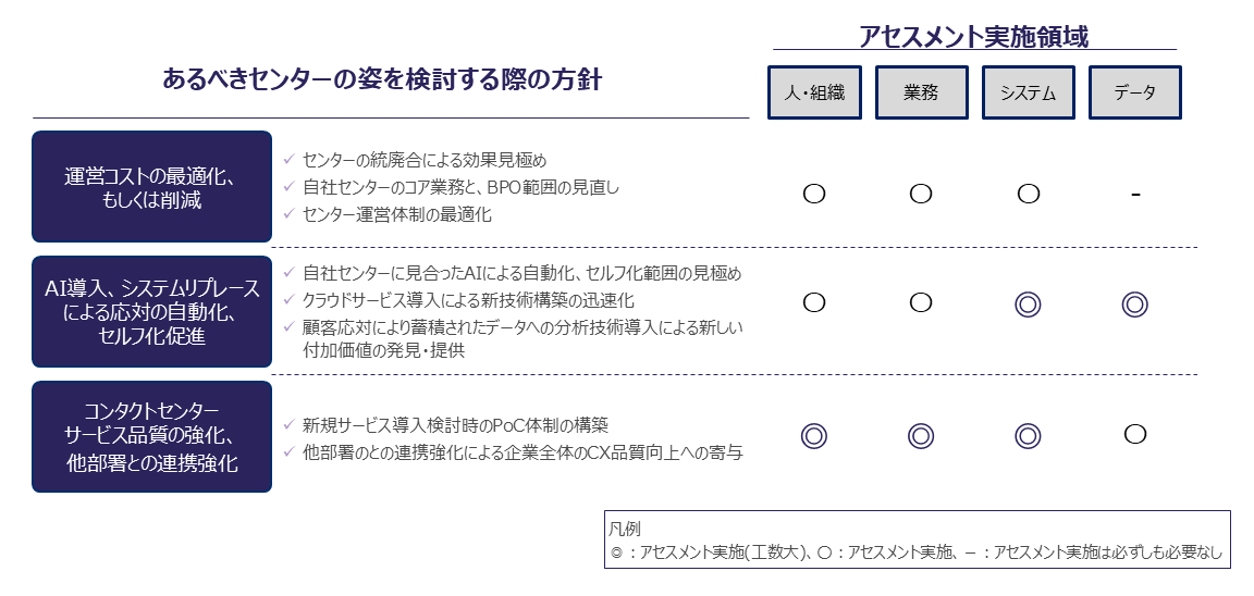 「あるべきセンターの姿」の検討方針が明確であれば、方針に沿ってアセスメント領域を特定することで、短期間での対応が可能です。