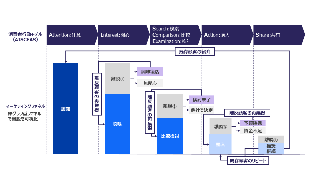 マーケティングでよく使われる「マーケティングファネル」と呼ばれるフレームワークがあります。このフレームワークでは、顧客が認知→興味→比較検討→購入→継続/推奨に至るまでのステップを踏む過程で、顧客の離脱が起きることを前提としています。このため、当初の見込客数に対し、最終的に購入に至るのは一部にあることから、全体の形が逆三角形の形状となります。