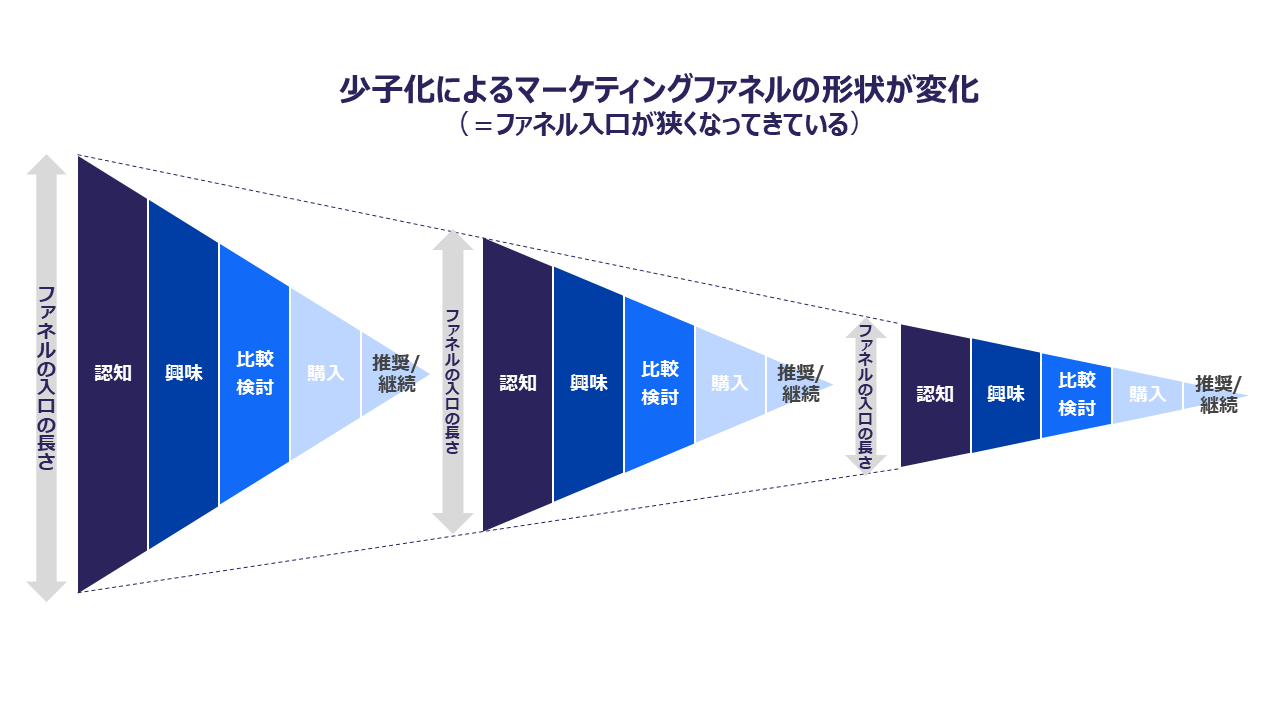 しかし、日本のような少子化社会ではそもそもの見込顧客の数が減少しており、ファネルの入り口自体が年々狭くなっています。