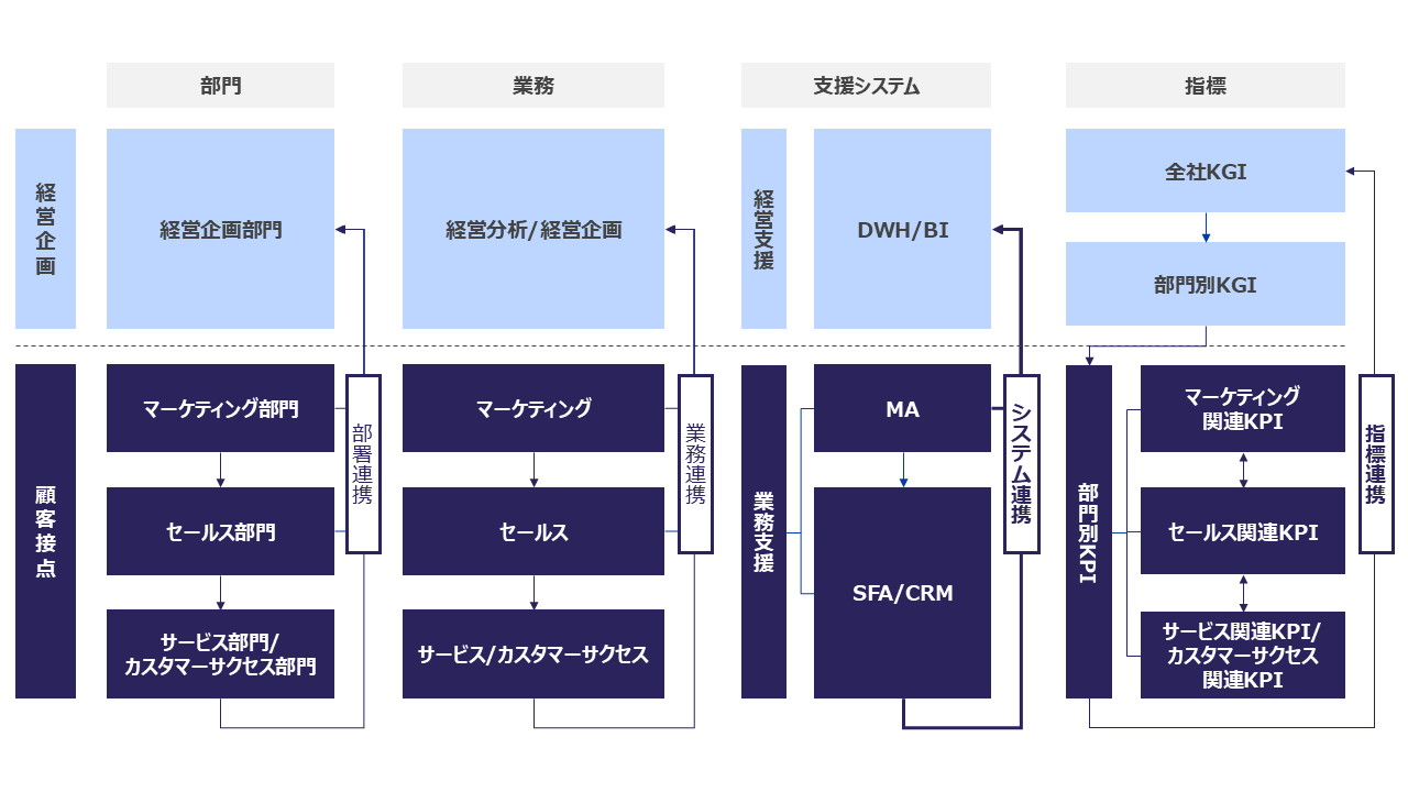 漏れがちな観点として、業務支援システム(MA、SFA/CRMなど)と経営支援システム(データ基盤、BIなど)との連携があります。漏れてしまう理由は2点あります。1点目は、業務支援システムは現場業務を支える一方で、経営支援システムは全社的な意思決定や分析を支えるため、導入部門が多岐にわたり、運用体制が複雑になることが多く、連携の設計が後回しになってしまうというものがあります。2点目は、システムごとにデータ形式や粒度、更新頻度が異なり、データを統合的に扱うこと自体が難しいというシステム的な難易度の高さがあります。