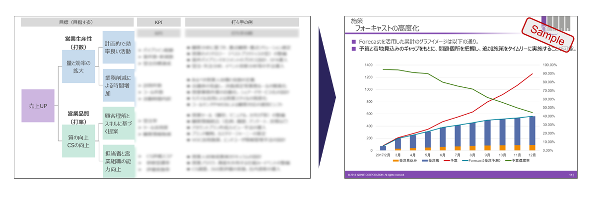 可視化されたデータに基づき、貴社の課題に合わせた改善施策を立案します。具体的なアクションプランに落とし込み、実行まで伴走することで、着実な成果創出を支援します。アセスメントの結果をもとに、売上UP、営業生産性、営業品質、顧客満足度の向上など、貴社の目標達成に必要な打ち手をご提案します。