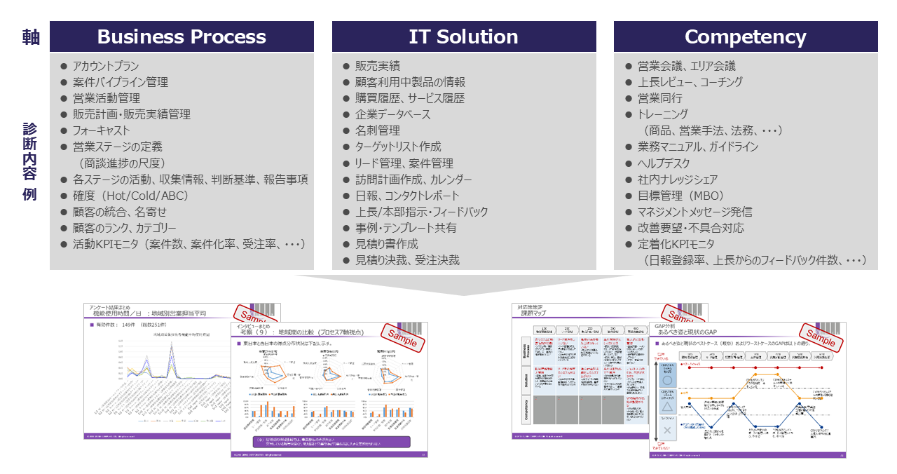 貴社の営業担当者様の行動特性やスキルを可視化し、成果との相関関係を分析します。これにより、組織全体として強化すべきポイントや、個々の担当者様の育成課題を明確にできます。営業プロセスごとに「Business Process・IT Solution・Competency」の3軸でヒアリングとデータ分析を行い、整備度合いと課題を診断します。
