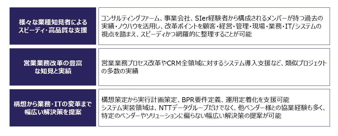 コンサルティング領域に加え、事業会社やSIer経験者の知見・経験を有し、顧客・経営・現場等の視点を持つ網羅性と豊富な実績が強みです。実績・フレームワークを活用し、改革ポイントをスピーディかつ網羅的に整理し、実現性の高い提案により貴社の営業力強化を支援します。