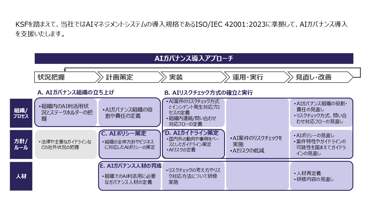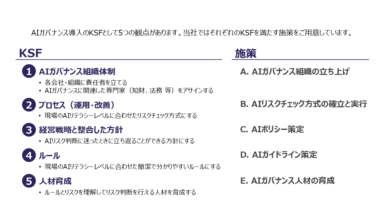 AIの活用が進む中、企業には適切なガバナンス体制の構築が求められています。当社では、「信頼あるAI活用に向けたAIガバナンス整備支援」を提供し、リスク管理と責任あるAI利用を実現します。組織体制の整備からルール策定、人材育成まで、包括的なアプローチで企業のAI活用を安全かつ持続可能なものにします。AIガバナンスは単なる規制対応ではなく、経営戦略と連動した価値創出の基盤です。当社の支援により、信頼性・透明性を確保しながら、AIの可能性を最大限に引き出す環境を構築します。