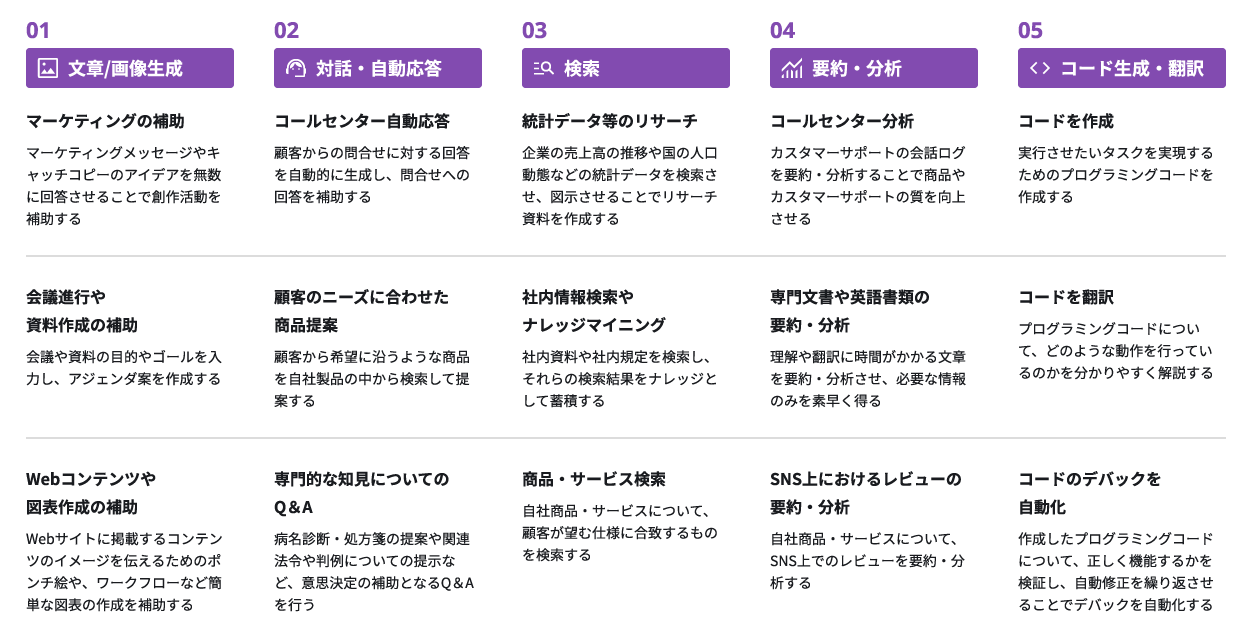 ChatGPTの活用により効率化が見込める一般業務について、機能ごとにいくつかの例を紹介します。