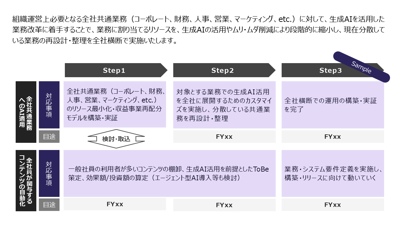 生成AI CoEが起点となり、全社横断的に統制を効かせていくためには、生成AI CoEの各機能が連動し合うことが必要不可欠です。全社的に生成AI活用によるビジネス価値創出の戦略を立て、その実現に向けたロードマップを策定する、その営みを各機能で共通認識を持たせながら推進するマネジメントを担います。これにより、分散した取り組みを統合し、全社的な生成AI活用を加速させ、持続的な競争力強化を実現します。