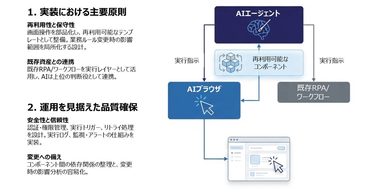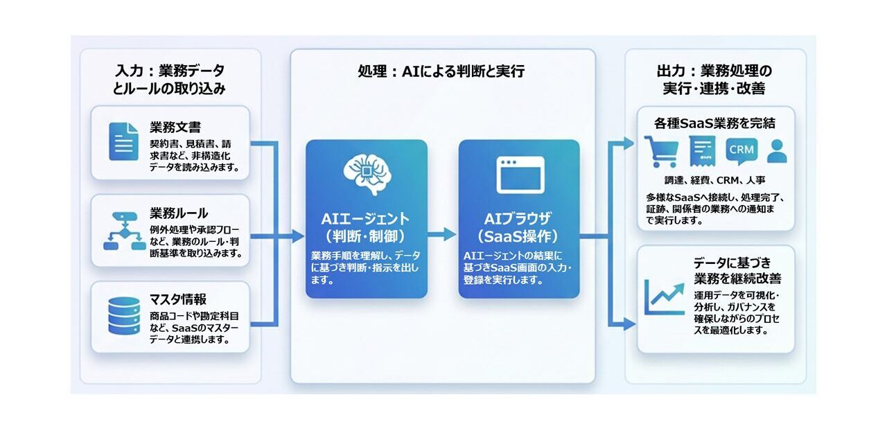 AIエージェントが手順とコンテキストを踏まえて情報収集・判断・指示を行い、その指示に沿ってAIブラウザがSaaS(SAP Ariba、SAP S/4HANA、Coupa、ServiceNow、Salesforceなど)の画面上で検索・入力・登録・添付・ステータス更新などの操作を実行可能にします。そのうえで、画面操作は変更影響を抑えやすい形で部品化し、再利用性を考慮したテンプレートとして整備します。