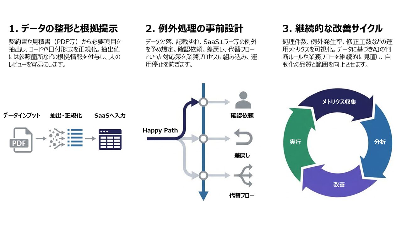 一方で、実運用では欠落・表記揺れ・未確定情報・添付不足・SaaS側エラーが発生し得るため、確認依頼や差し戻し、再実行、代替フローを最初から運用に組み込みます。