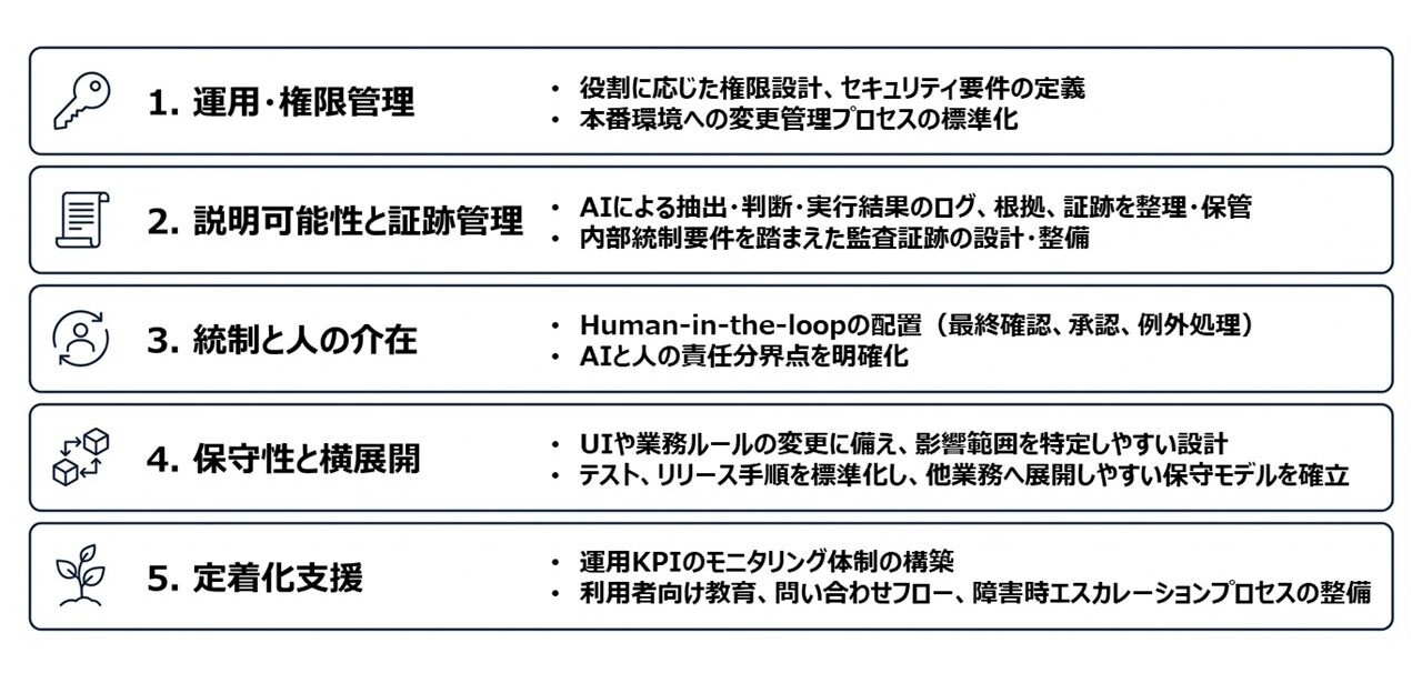 また、Human-in-the-loopは要件に応じて配置し、最終確認・承認・例外処理の責任分界を明確化します。