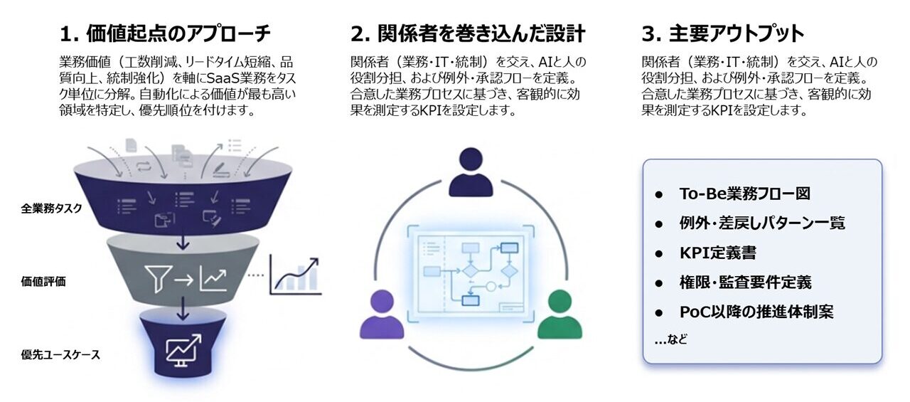 工数削減、リードタイム短縮、ミス低減、統制強化といった業務価値から逆算し、SaaS業務をタスク単位に分解したうえで優先ユースケースを選定します。次に、AIエージェントに任せる判断・照会、AIブラウザ(実行役)に委ねる画面操作、人が担う統制ポイントを切り分け、To-Be像とKPIを関係者(業務・IT・統制)で揃えます。