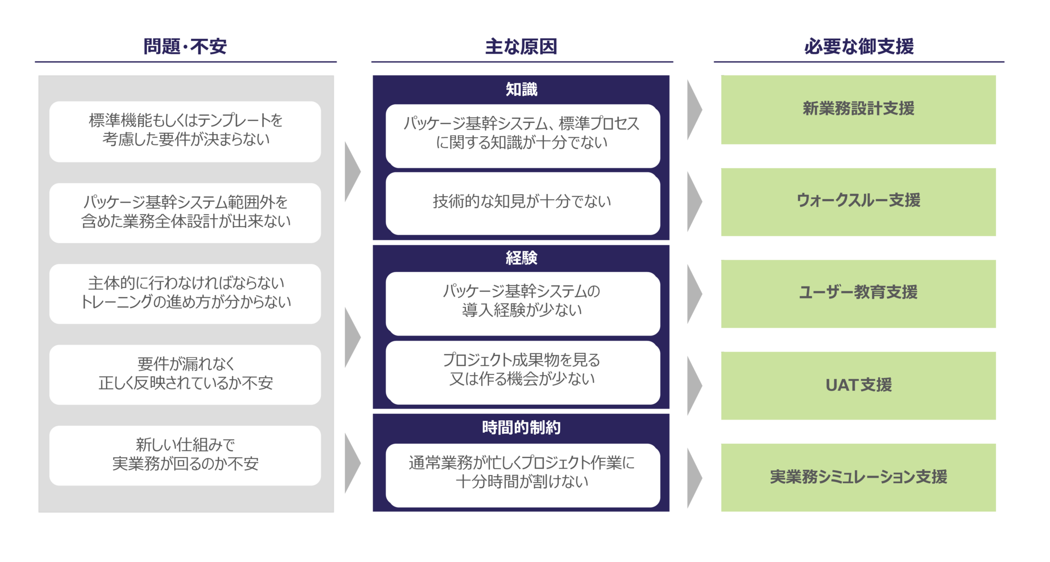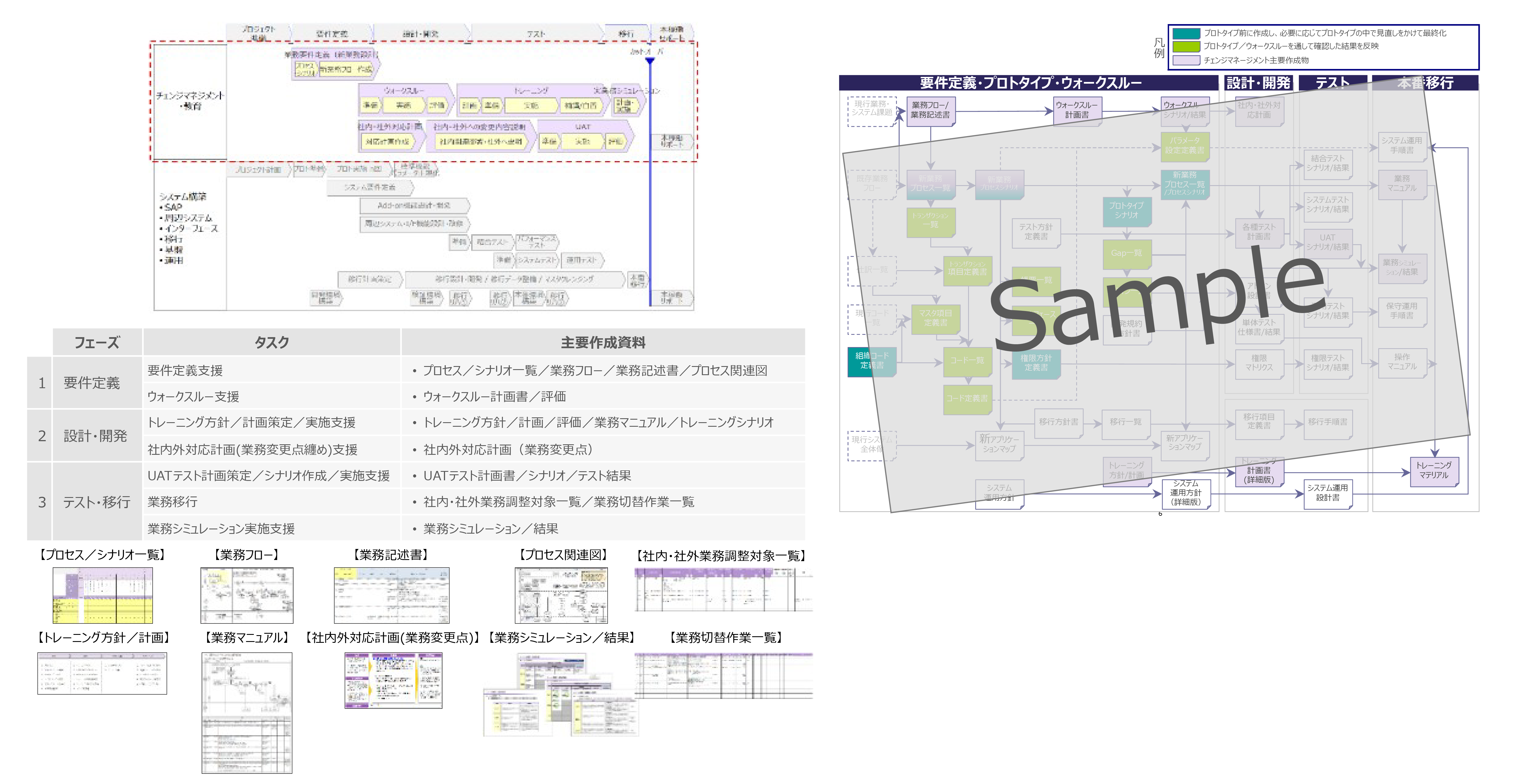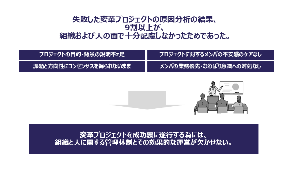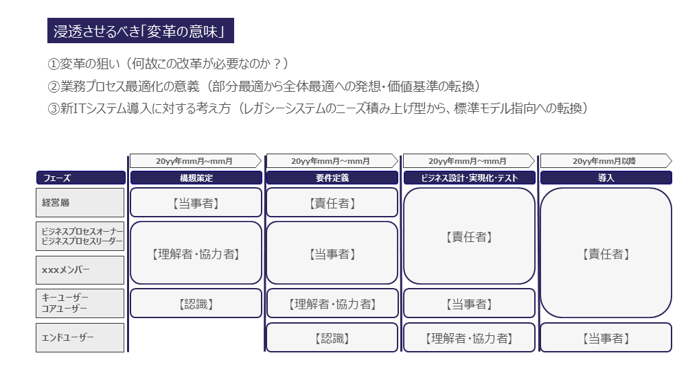 プロジェクトを成功裏に遂行するために、啓蒙とコミュニケーション、トレーニング、組織/評価の変革というチェンジマネジメントの4大タスクを効率的に推進し、参画者の意識と知識の変革を行い、変化に対する不安感をなくし、新しい業務プロセスや情報インフラの環境に容易に適応できるように、永続的に支援することです。