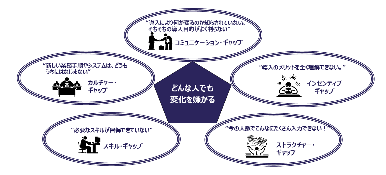 BPRなどの変革の現場で挙がってきた声は下記のように分類され、それらのギャップが変革に対する抵抗要因となります。