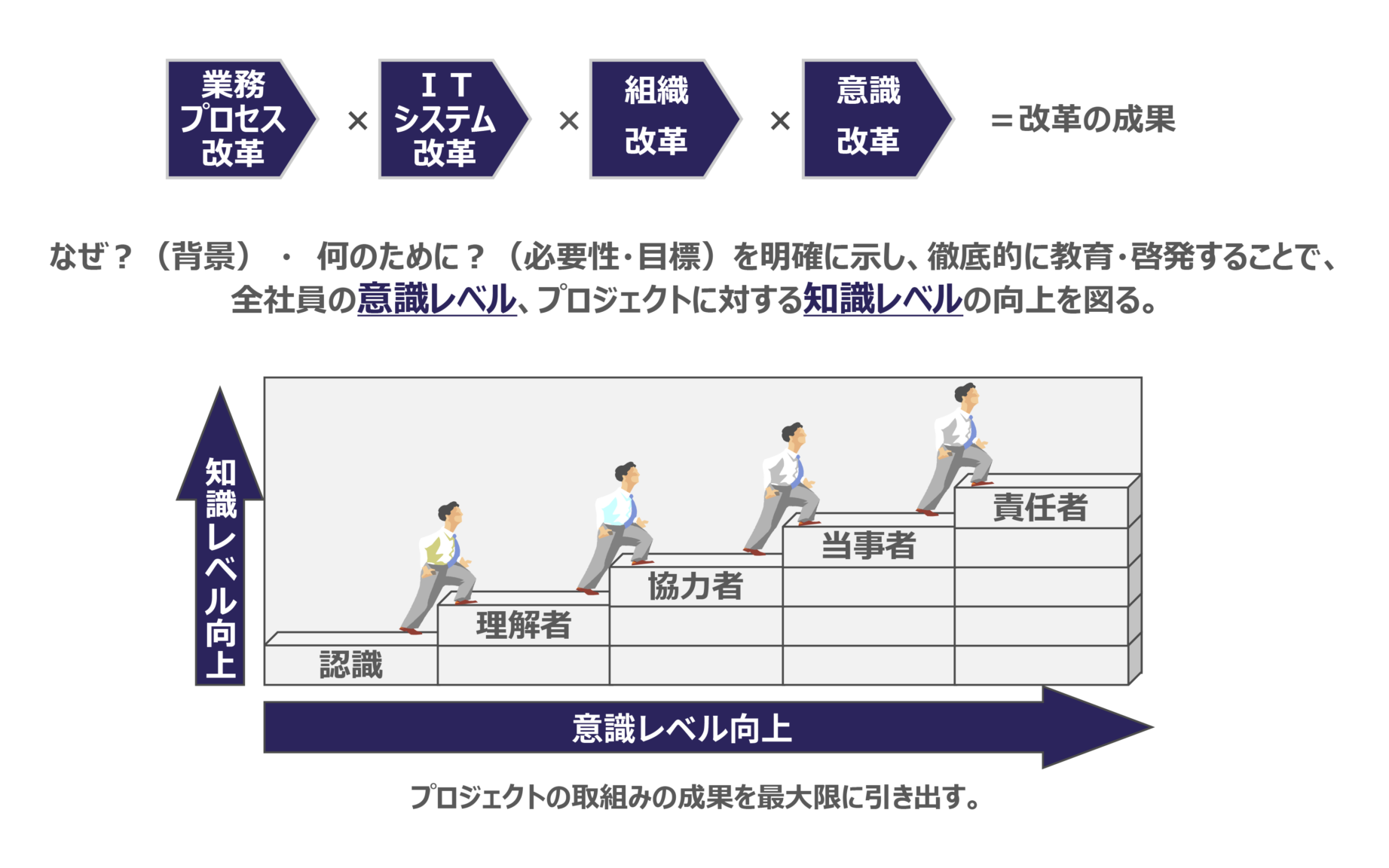 業務改革/IT改革の実行過程において、変化に対応していくために人の意識・知識を正しく浸透させることが重要です。 いかにすばらしい業務プロセス・システムを設計しても実践する人の意識を変えられなければ成果はありません。 「変革の意味」を浸透させていくためには、関係者ごとに意識レベルをプロジェクトの進度に応じて段階的に高めていくことが重要です。
