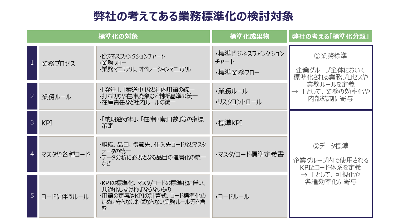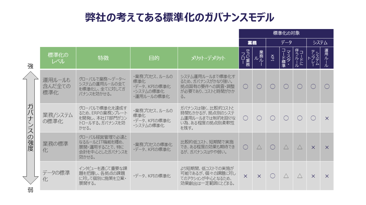 業務標準化だけではなく、データ標準も含めて検討いたします。御社の実情を踏まえて、標準化のガバナンスのモデル、導入ステップの設計を行います。