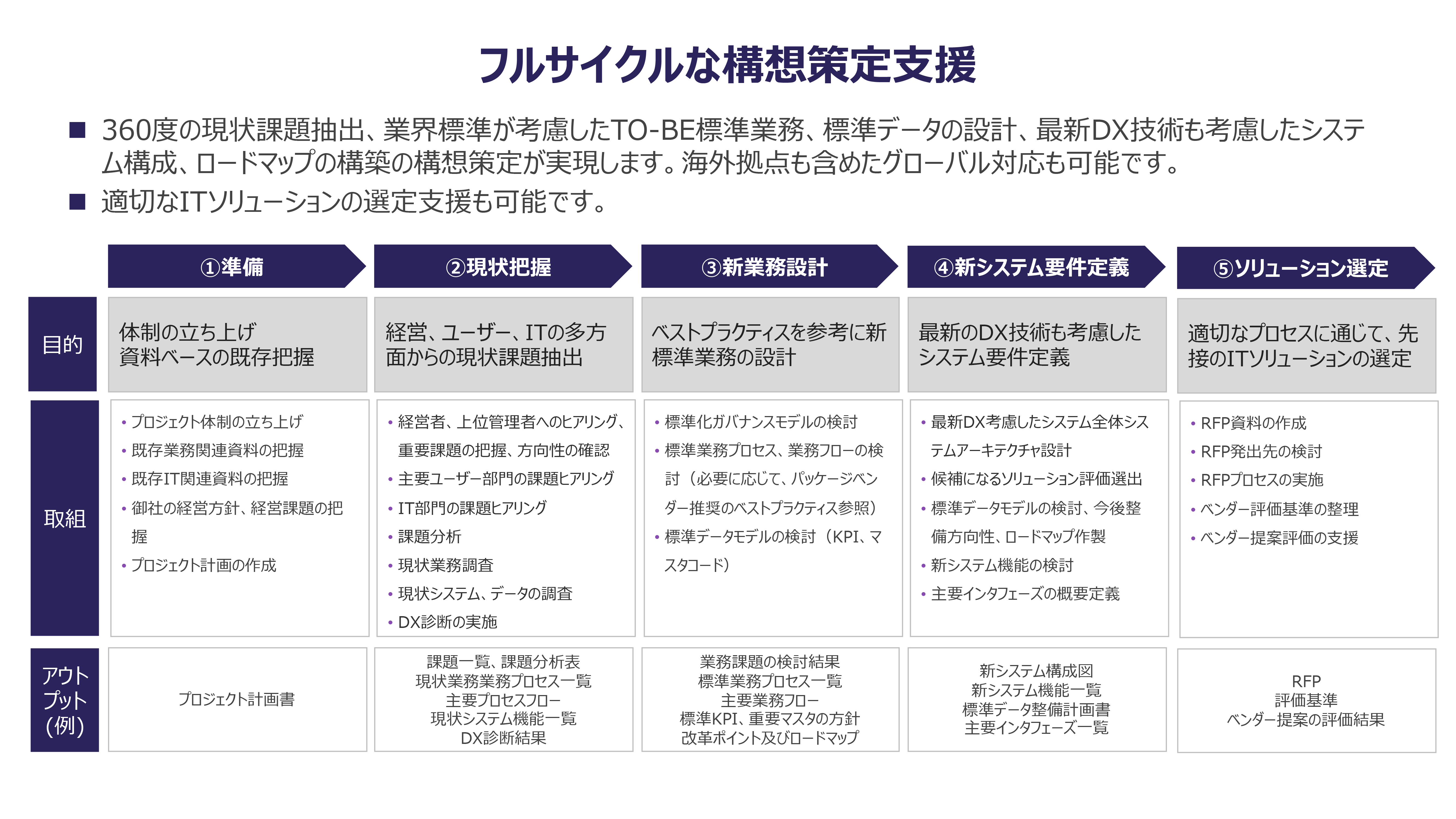 経験豊富な基幹システム分析の専門家により、基幹システムの構想策定の支援を行います。サービスの内容として、360度の課題調査分析、業界標準の適用による徹底した業務標準化の業務分析、業務設計を行い、DXの最大活用によるTO-BE業務の構想策定を実施致します。海外拠点も含めたマルチ言語によるグローバル支援が可能です。また、必要に応じて、クライアントの視点で、適切なソリューションパッケージの選定支援も可能です。