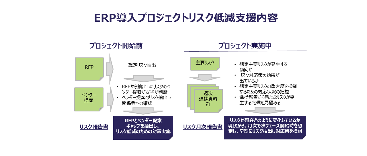 基幹システム導入プロジェクトの推進を前提とし、プロジェクトを成功させるために第三者視点で早期にリスクを抽出し、実現性の高いリスク低減策を打ちます。