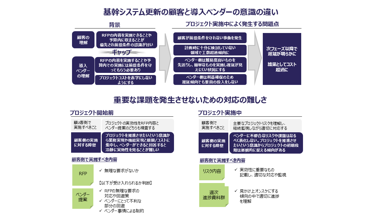 DXを通じた企業変革が求められる中、基幹システムの更新プロジェクトが進んでいます。過去の基幹システム更新時よりさらにシステム化が進み複雑化していることや、前回更新を経験した顧客側の知見者がすでにいない状況などがあり、プロジェクトの難易度が上がっています。また、導入ベンダー側も難易度が高いプロジェクトでリスクを感じた場合、その部分についてベンダー自身が責任を負わないように必ずリスクヘッジをします。そのため、そこに理解の差(顧客側は依頼通りにやってくれると考える一方、ベンダー側はやれないと思っても、ベンダー選定で自社が落とされないようにその場はやれると言い、やれない場合その責任を負わないように工夫しておく、など)が生まれ、それがプロジェクト実施後に重要な課題に発展することが多くあります。