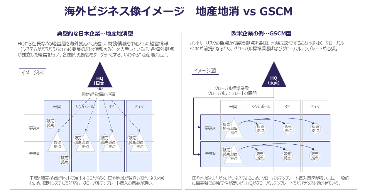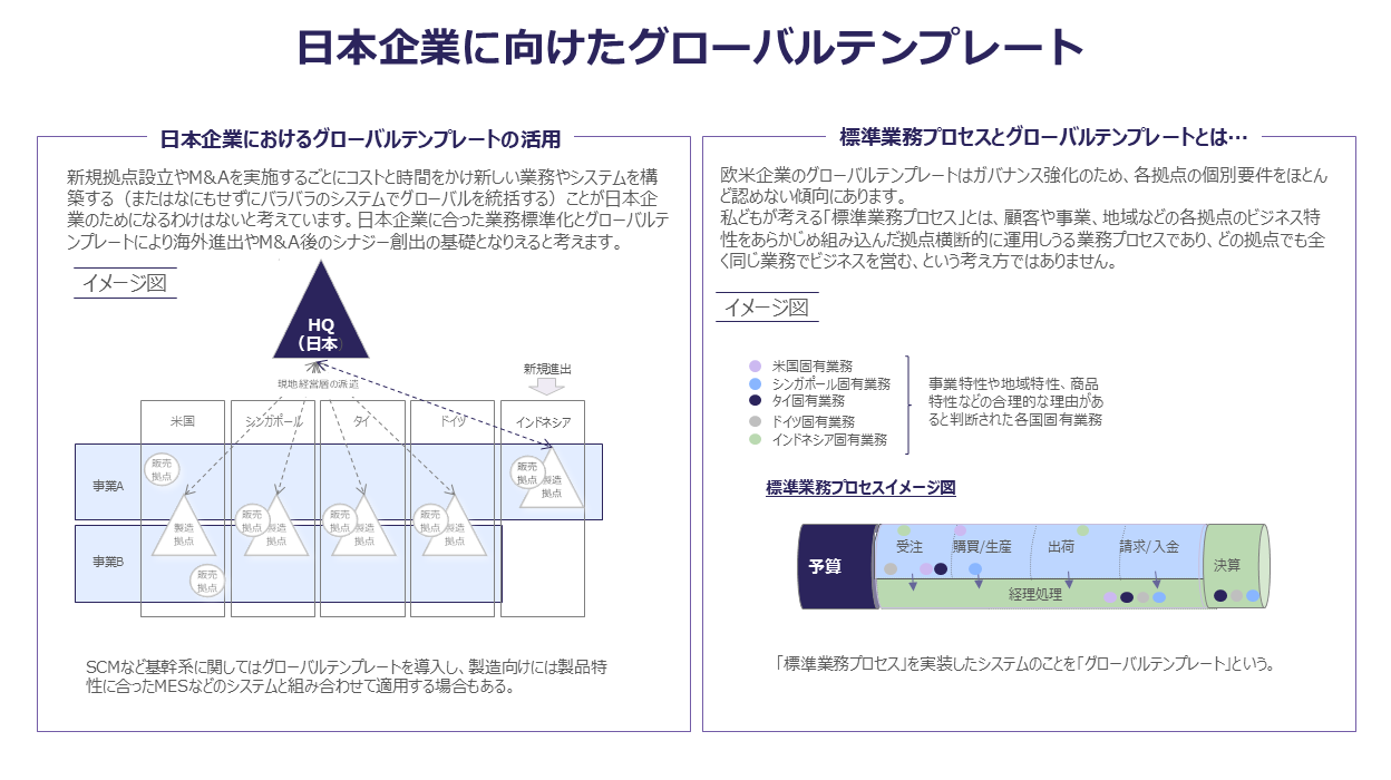 十数年以上前から、欧米企業はグローバル標準業務の策定とそれを実装したシステム(グローバルテンプレート)を海外拠点に展開、グローバル全体で一元的に経営・業務データを見、グローバル全体でのオペレーション最適化、在庫や原価の削減活動などを推進してきました。
