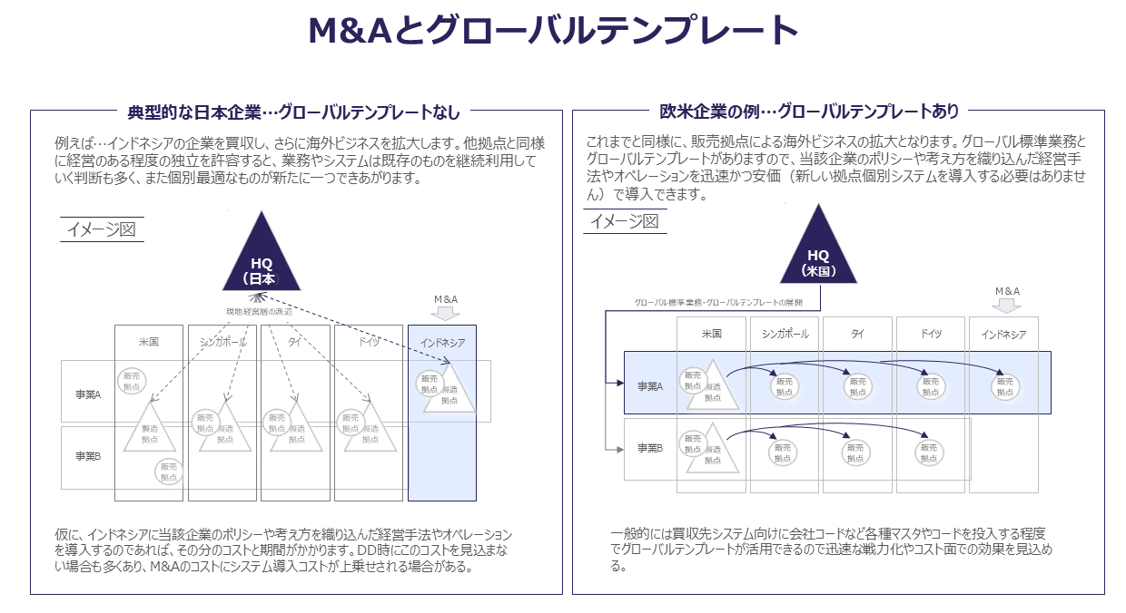 グローバルテンプレートを展開することにより安価かつ迅速にグローバル標準業務、管理手法で一体運用をすることが可能になり、さらに当該事業、当該市場などに基づいた活動を加えることでさらなるシナジー創出が可能です。