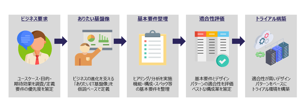 ビジネス要求のヒアリング:お客様の「ありたいIT基盤像」を仮説ベースで定義し、進化を支える理想的な基盤を明確化。