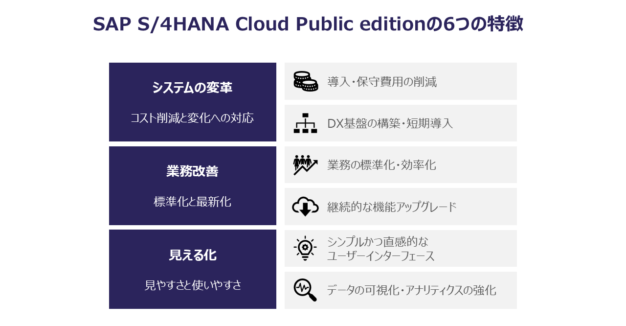 国内外の企業において、パブリッククラウドを基幹システムとして採用する比率が年々高まっています。パブリッククラウドはハードウェアが不要となり、インターネット接続があればどこからでもアクセスでき、スケーラビリティに優れています。SAP S/4HANA Cloud Public Editionを導入し、企業の変革を実現するコンサルティングサービスを当社は提供しております。