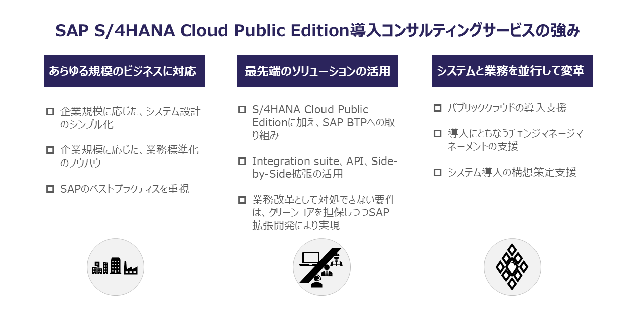 SAP AWARD OF EXCELLENCE 2025において「SAP S/4HANA® Cloud Public Edition Award」を受賞するなど、当社のクラウドソリューションの実績は高い評価を受けております。当社のコンサルティングサービスの強みは、以下3つです。