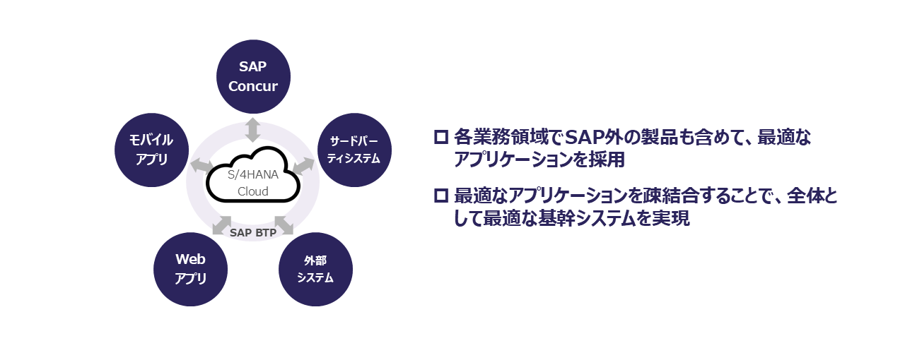 このような課題を解決するための新たな考え方が、クリーンコアアプローチです。各業務領域でSAP外の製品も含めて最適なアプリケーションを採用し、疎結合することで全体として最適な基幹システムを実現します。当社はSAP S/4HANA Cloud Public Editionを活用することによりクリーンコアを実現します。