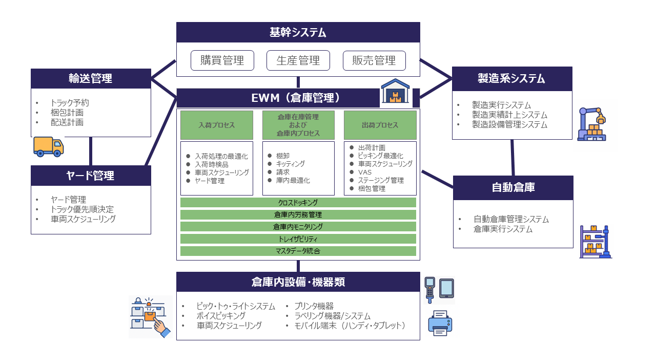 当社では、Extended Warehouse Management(EWM)単体ではなく、ERP(販売・購買・生産)やTM(輸送管理)、MES、モバイル端末、帳票・ラベル印刷など、倉庫業務に関わる周辺ソリューションも含めたトータルな視点でのソリューション提案が可能です。これまで様々なお客様の導入事例から、業務や業種に応じた“ちょうどよい組み合わせ”を見極め、全体最適の構成でご支援いたします。EWMの効果を最大限に引き出すために、単独の導入ではなく、業務フロー全体を俯瞰したご提案を行えるのが当社の強みです。