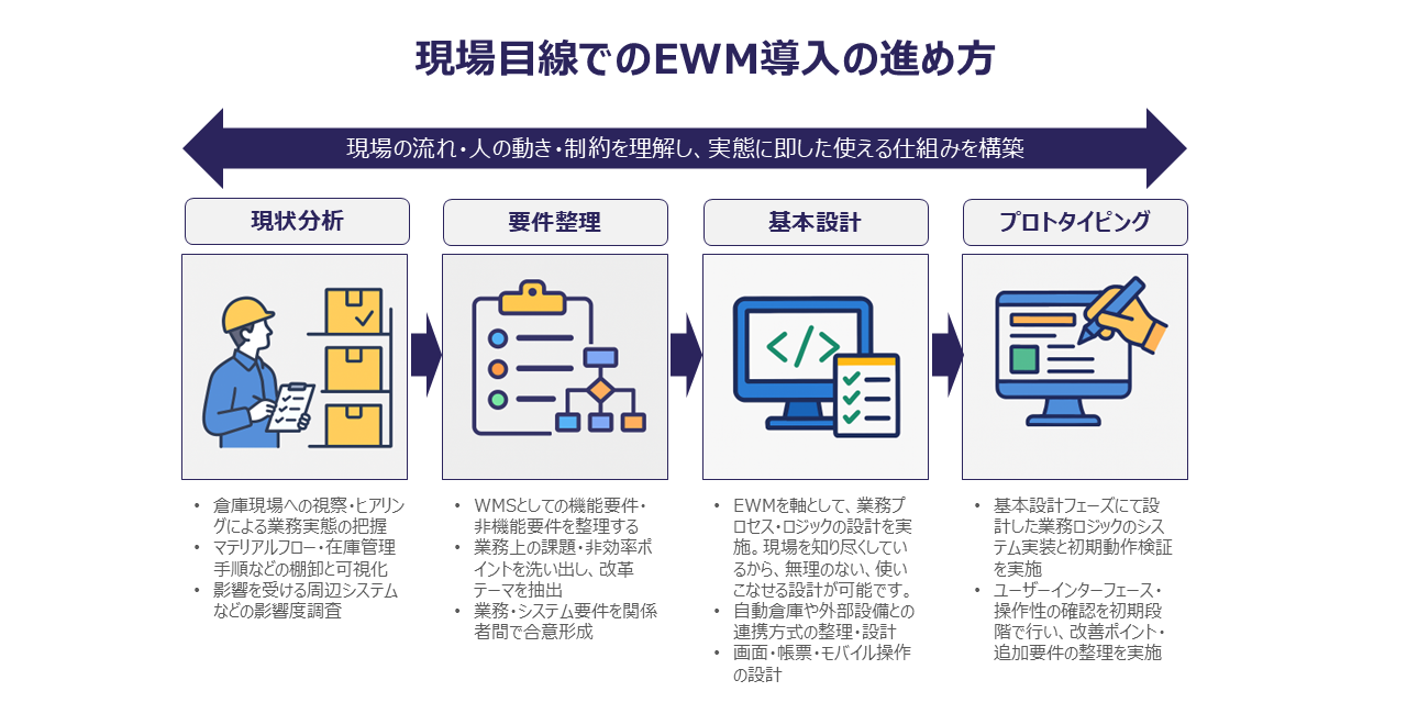 EWMは高度で柔軟な機能を多数備えた倉庫管理システムですが、「導入すれば終わり」ではありません。当社では、現場で実際に業務に携わるユーザーの視点を重視し、倉庫現場に無理なくフィットする設計を行います。また、現場教育・操作トレーニング・マニュアル整備・定着化支援までを含めて、“最後の一歩”まで丁寧にサポートするのが私たちのスタイルです。現場の声に耳を傾け、EWMを「使いこなせる仕組み」として根付かせるところまで、しっかりと寄り添ってご支援します。