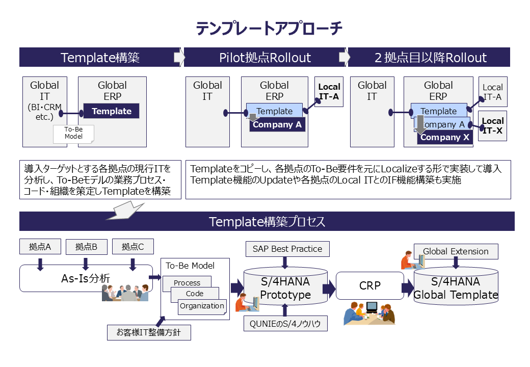 当社のテンプレートアプローチは、以下のプロセスでグローバルテンプレートを構築し、必要なローカライゼーション(拠点要件の追加実装)を施して各拠点に順次導入するものです。