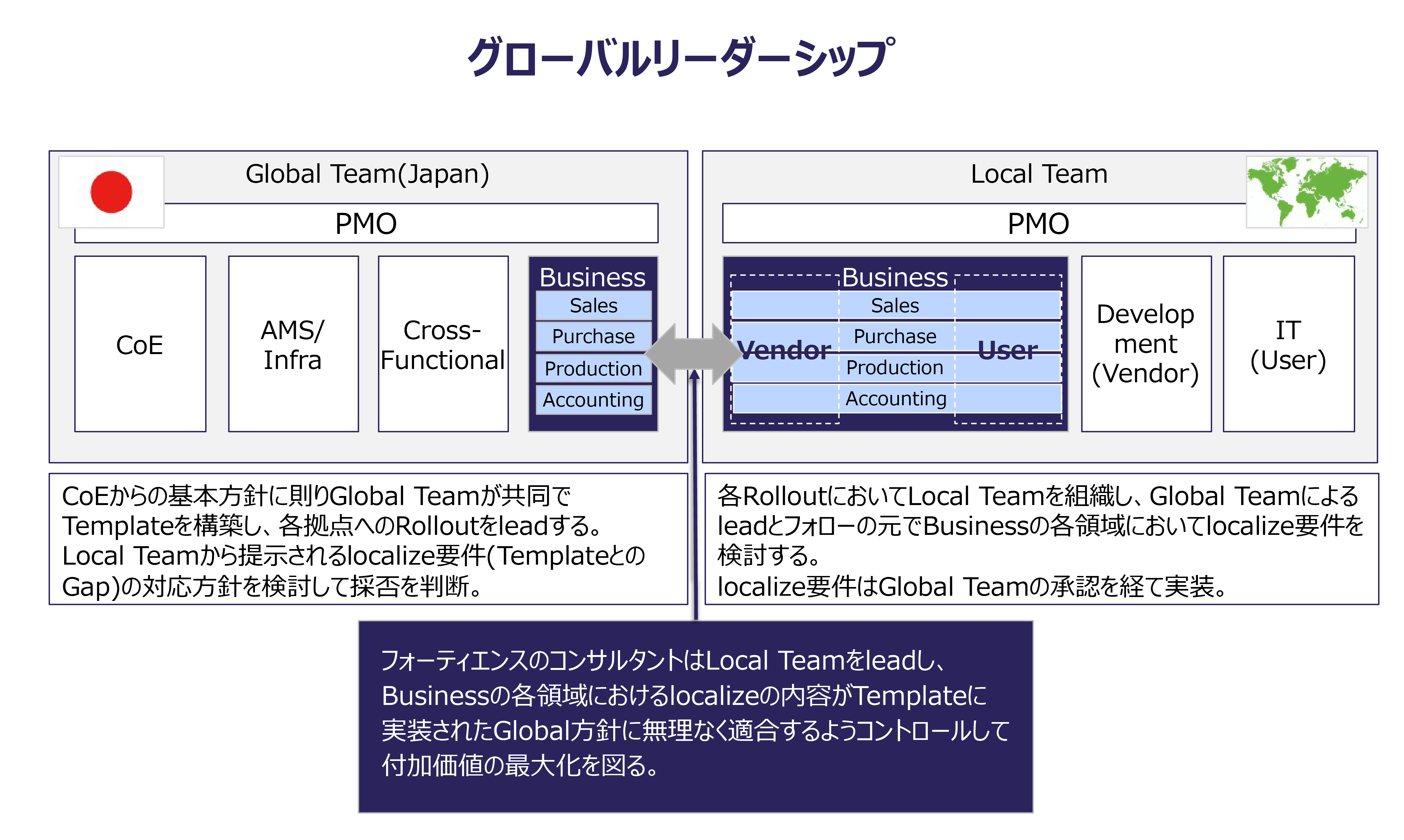また、どの形態であっても当社のコンサルタントはS/4HANAのエキスパートとして培った専門知識に加えコミュニケーション能力およびリーダーシップを発揮して現地側メンバーへの指導と支援を行い、お客様の日本側と現地側の双方のご期待が適切なバランスで実現されるようにプロジェクトを推進します。