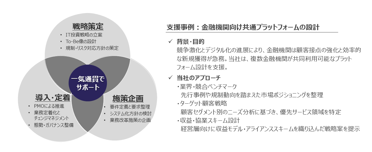 金融機関のIT企画は、外部環境の変化の速さやレガシーシステムの制約、部門間調整の複雑さなどにより、計画を実行につなげることが難しい領域です。当社はこれまで、戦略策定から施策企画、導入・定着に至るまで、各フェーズに応じた支援を提供し、プロジェクトを着実に推進してきました。
