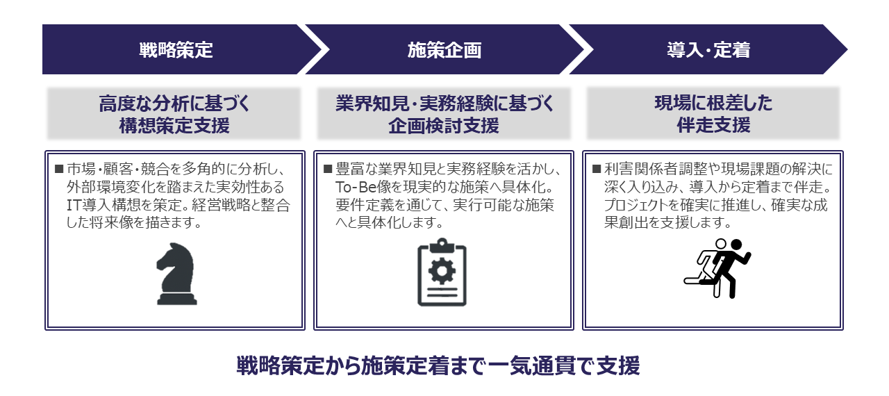 業界知見と実務経験を活かし、上流から下流まで一気通貫で伴走することで、実効性ある成果創出を実現します。