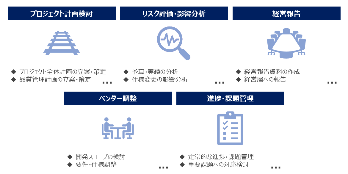 当社には業務・ITに精通し、豊富なプロジェクト経験を持つ専門家が在籍しています。品質管理やリスク評価・影響分析といった 中核的なマネジメント に加え、経営層への報告、ベンダーとの調整、重要課題の検討支援まで幅広く対応可能です。進捗管理にとどまらず、利害関係者をつなぎ、意思決定を加速させることで、プロジェクトを着実に成功へと導きます。