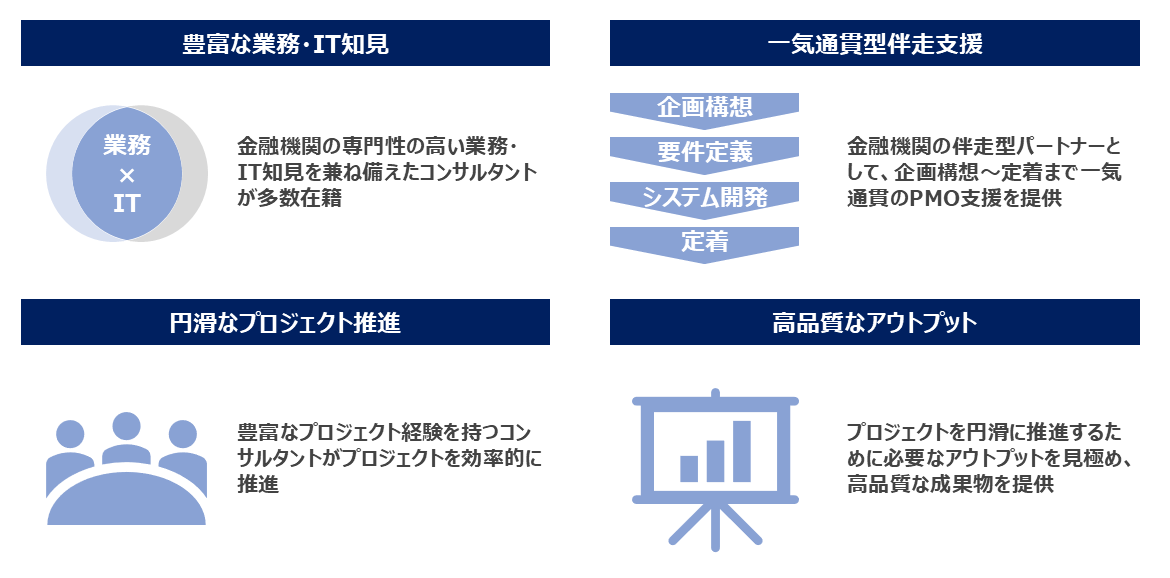 当社は、金融機関におけるシステム改革プロジェクトを 企画構想から開発・導入・定着まで一貫して支援してきた実績を有しています。業務・ITに精通したコンサルタントが、高品質なアウトプットを創出するとともに、プロジェクトを円滑に推進し、伴走型パートナーとしてお客さまの改革を成功へと導きます。