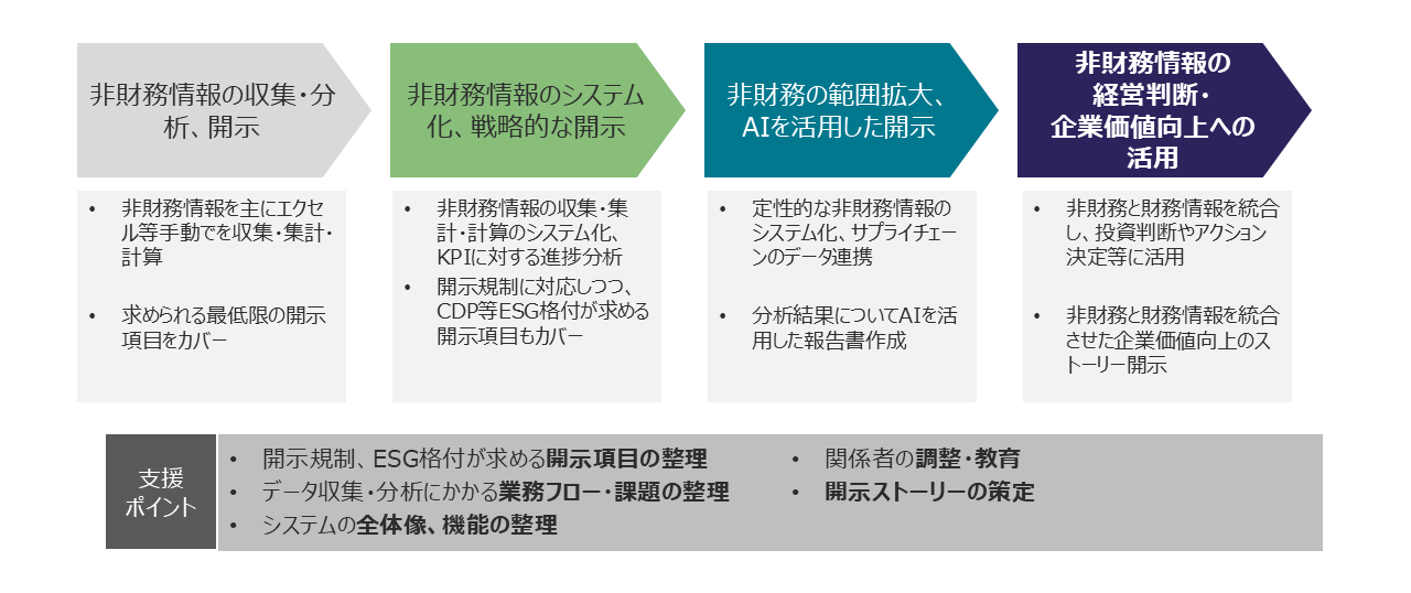 フォーティエンスは、グローバル企業が各拠点・各サプライヤーから非財務情報を一元的に収集・分析・活用できる体制の構築を支援します。CSRD・ISSBをはじめとする国際開示基準への対応だけでなく、現地法規との整合や多言語対応、開示対象の拡張も視野に入れ、業務とシステムの双方を設計。AIやクラウドを活用した効率的な情報収集・分析、開示資料の自動生成、社内ポータルでの共有などにより、非財務・財務情報の統合を前提とした情報基盤を整備します。