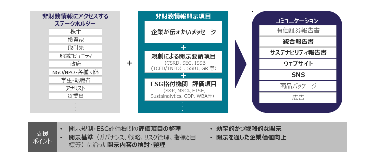 統合報告書、有価証券報告書、TCFD・TNFD開示、CDP対応、サステナビリティレポートなど、多様なグローバル開示チャネルへの対応を支援します。ESG評価機関(MSCI、S&P、Sustainalytics等)や規制当局、投資家・NGO・顧客など、国や利害が異なる多様なステークホルダーに向けて、整合性のあるメッセージと実績が一貫して語られるストーリーを設計。信頼構築・企業価値の可視化・社内意識の醸成をすべて叶えるアウトプットを構築します。