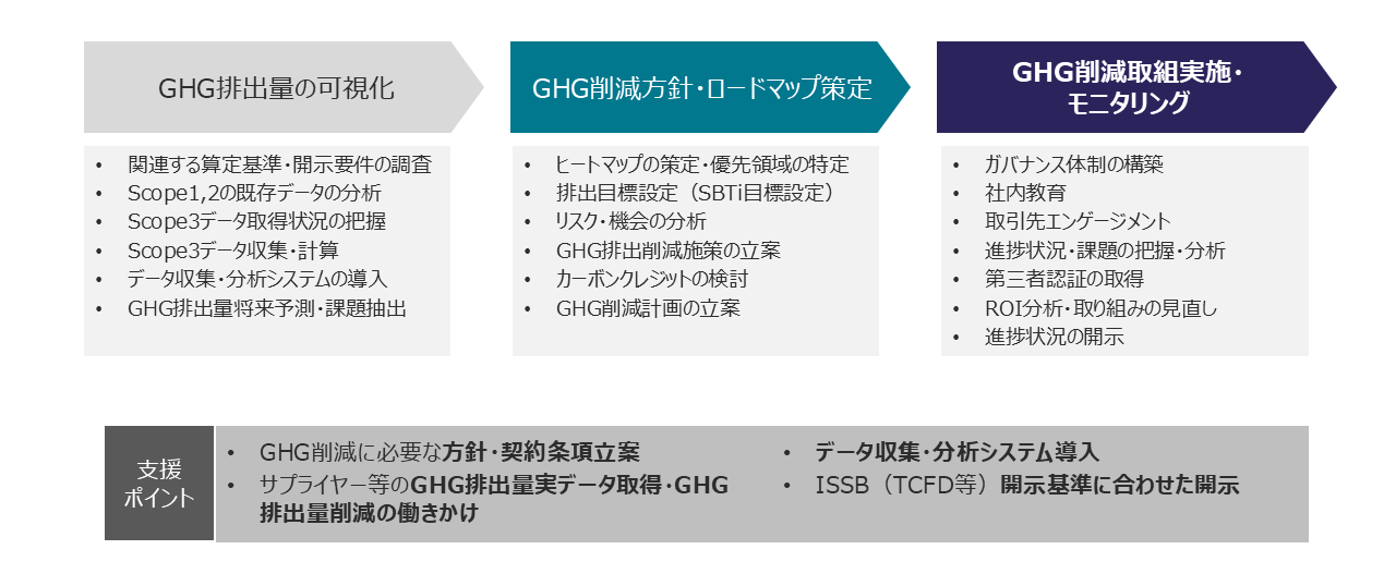 GHG排出量の可視化と削減を、グループ全体・サプライチェーン全体で一貫して実現するための支援を行います。Scope1〜3を対象に、拠点ごとの排出量データの標準化、SBTi準拠の目標設定、削減施策の選定と展開、第三者認証の取得、クレジット活用の検討までを包括的にサポート。地域ごとの規制やステークホルダーの期待に応じた方針策定・実行支援、さらにはサプライヤーへの働きかけや契約条件の整備を通じて、国境を越えた脱炭素マネジメントの実行基盤を構築します。