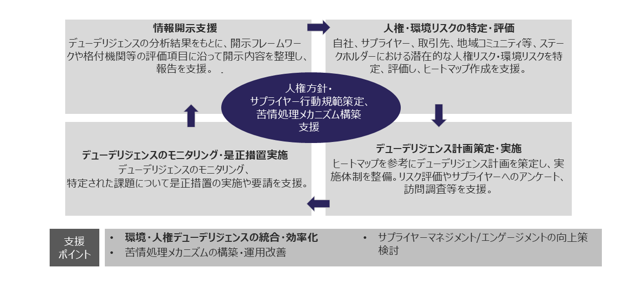 人権・環境デューデリジェンスの整備・実行を、CSDDDをはじめとする国際的な規制や社会的要請に対応した形で実装します。自社・サプライチェーン全体におけるリスクの洗い出し、ヒートマップの作成、サプライヤーの優先分類、方針・行動規範の整備、苦情処理メカニズムの構築、是正措置計画の運用まで、実務と規制を両立させた設計・運用を支援。UNGPやOECDガイドラインなど、国際的に信頼される枠組みに準拠した対応を推進します。