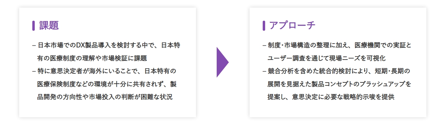 本プロジェクトでは、海外の意思決定者に対して、日本の医療制度、医療機関の経営構造、診療報酬体系、医療DX政策などを体系的に整理し、日本特有の医療環境に関する情報提供を行った。特に、日本の医療提供体制が複数の治療フェーズに分かれており、それぞれに制度的な制約や導入可能な技術が異なる点に着目し、製品展開における留意点を明確化した。これにより、クライアントは日本市場における事業展開の前提条件や機会を多面的に理解し、グローバルでの意思決定に向けた共通認識を形成することができた。