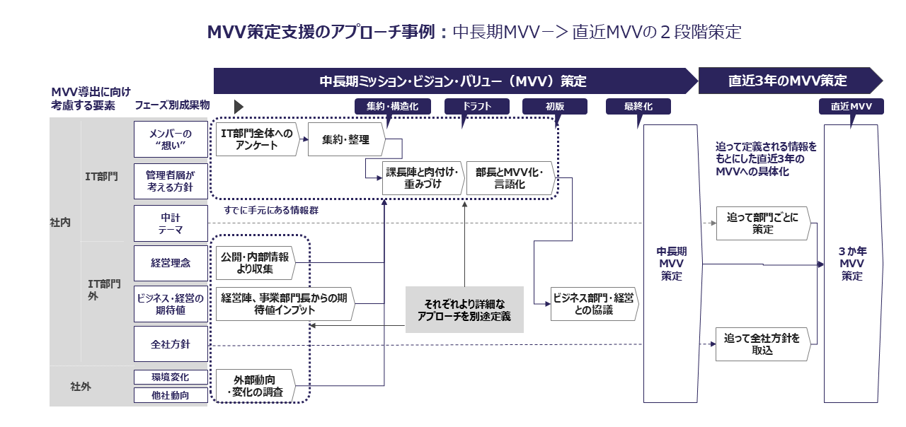 IT部門をはじめとする多様な部門における、目指す姿やミッション・ビジョン(MVV)策定などの豊富な実績にもとづくノウハウを活かし、変化の激しいビジネス環境において部門組織が一丸となってミッション・ビジョンを検討していけるようリードします。