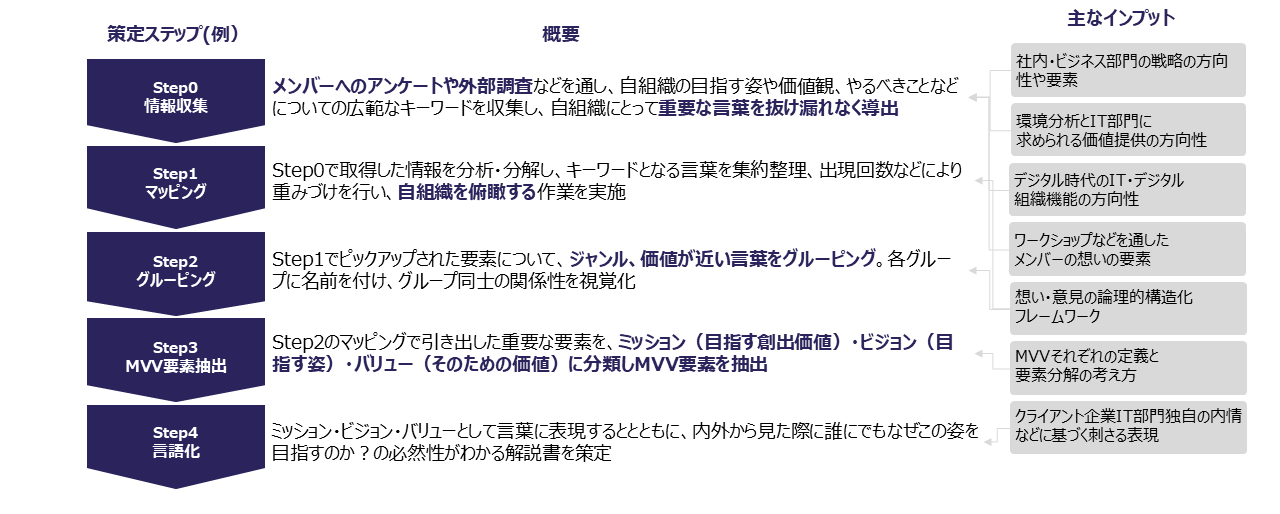 本サービスでは、IT部門の変革に向け、ミッション・ビジョン・バリュー(MVV)の策定を支援します。