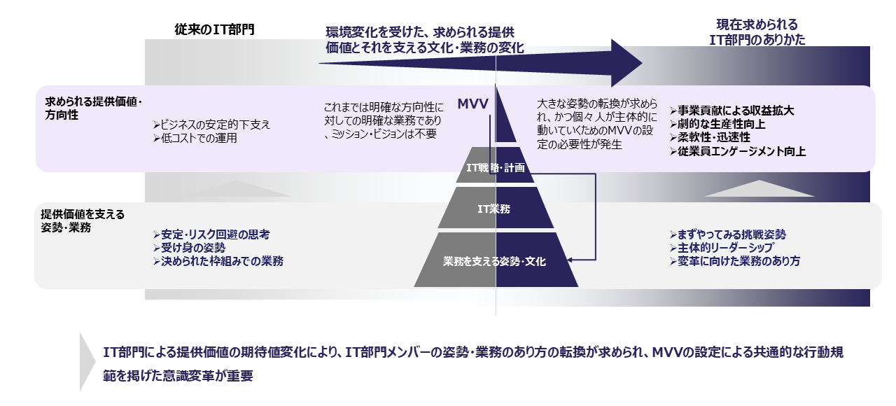 そのための各種整備に先駆け、IT部門全体として目指すありかた“ミッション・ビジョン“を策定し、共通的な目標と価値観を持ったうえでIT部門自体が変革を遂げることにより、企業全体の変革に寄与することが重要です。