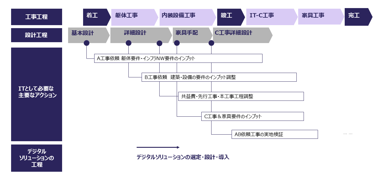 デジタルソリューションの選定や手配の時期を導入時期から逆算し予定することが一般的ですが、ビルの設計工程上、IT部門の想定よりも早くIT側の要件インプットや先行工事が必要となることがあります。