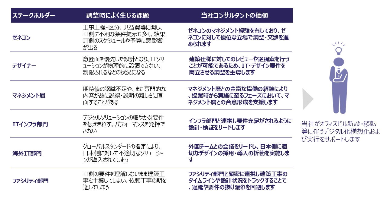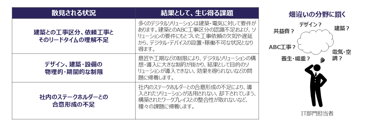 オフィス環境刷新に伴うワークプレイスのデジタル化の推進において、IT分野外となる建築・設備との取り合いを始めとした制約などが多く存在します。それらの認識・手当不足により、導入予定のソリューション設置不可、遅延、想定以上の費用拠出など、種々の課題への帰着状況が散見されます。