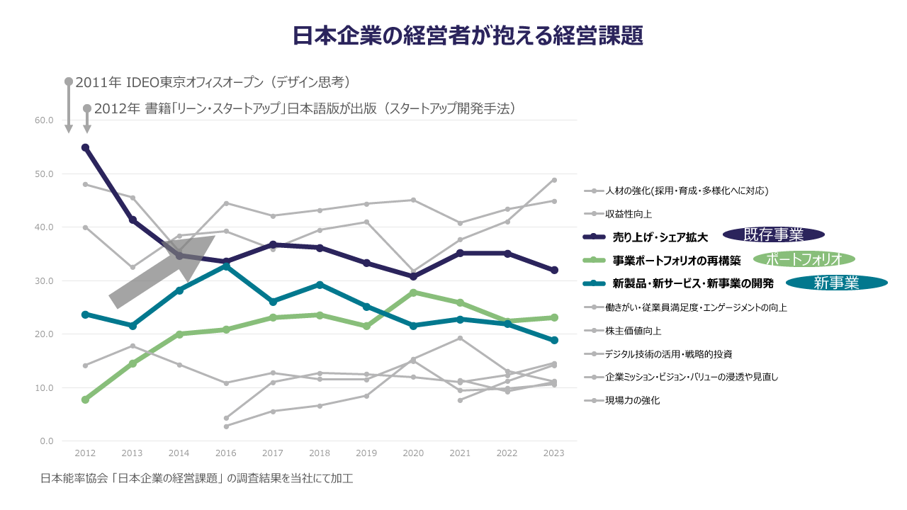 特に2010年代前半から後半にかけて、デザイン思考やリーンスタートアップといった先進的な事業開発手法が注目を集めるようになり、それに伴い新規事業への期待も一段と高まりました。