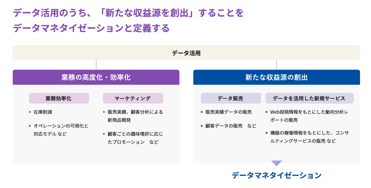 データマネタイゼーションとは、「保有するデータを活用して、新しい提供価値および収益源を創出する取り組み」です。