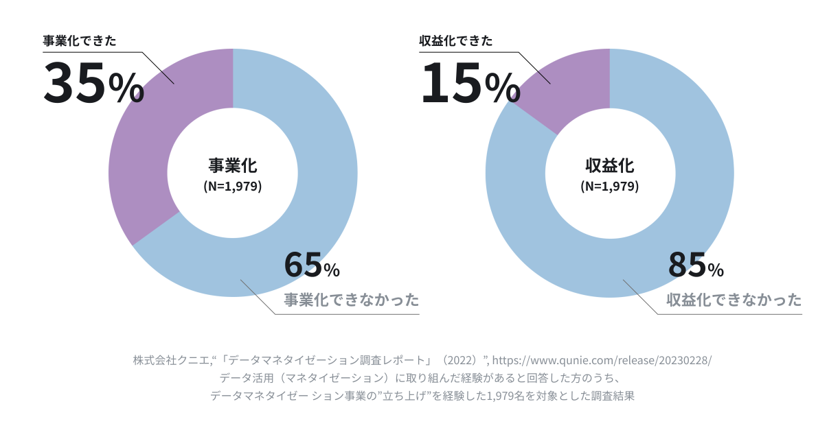 冒頭で「データマネタイゼーションが注目されている」と述べましたが、日本においてデータマネタイゼーションを実現させた方はまだ少ないのが現状です。フォーティエンスが2022年9月に実施した、日本企業を対象としたデータマネタイゼーションの実態調査によれば、データマネタイゼーションを事業として立ち上げた経験がある回答者を対象として、立ち上げ状況を調査したところ、実際に事業化まで至ったのは35%、また収益化まで至ったのは15%に留まっています。