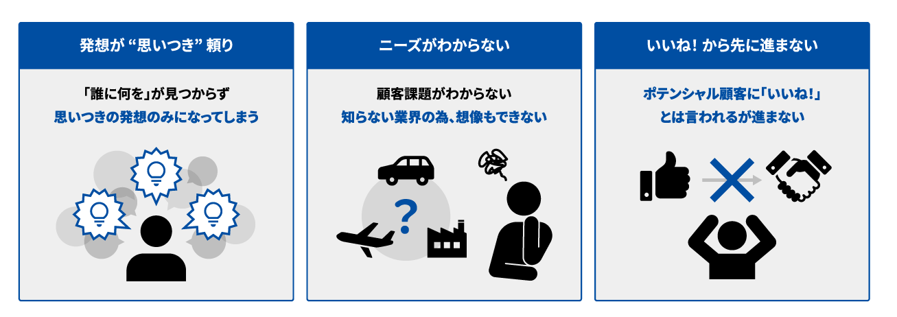 アイディエーションのプロセスと、顧客課題をもとにビジネスアイデアを企画するものの、そこから上手く検討が進まないケースもあります。特に「ポテンシャル顧客への壁打ちでは反応は良いが、そこから先に進まない」といったビジネスアイデアの検証および評価・選定で躓いているケースが見られます。