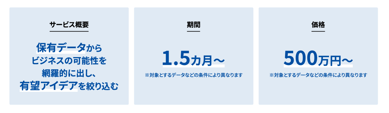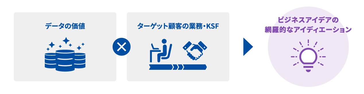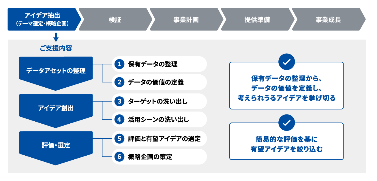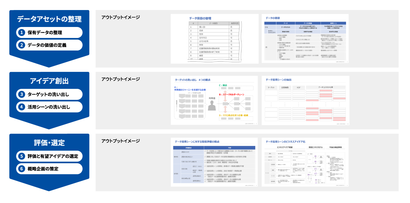 「データアセットの整理」「アイデア創出」「評価・選定」の側面から、事業化をご支援します。